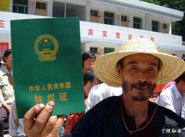 (2007年7月19日,宁陕县新场乡林权证颁发现场会上,林农袁修福拿到首张林权证。 资料图)