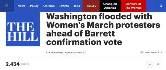 据美国《国会山报》17日报道,当天上午11时左右,数百人聚集在自由广场,他们手持标语,抗议美国最高法院官候选人巴雷特进入最高法院的程序。